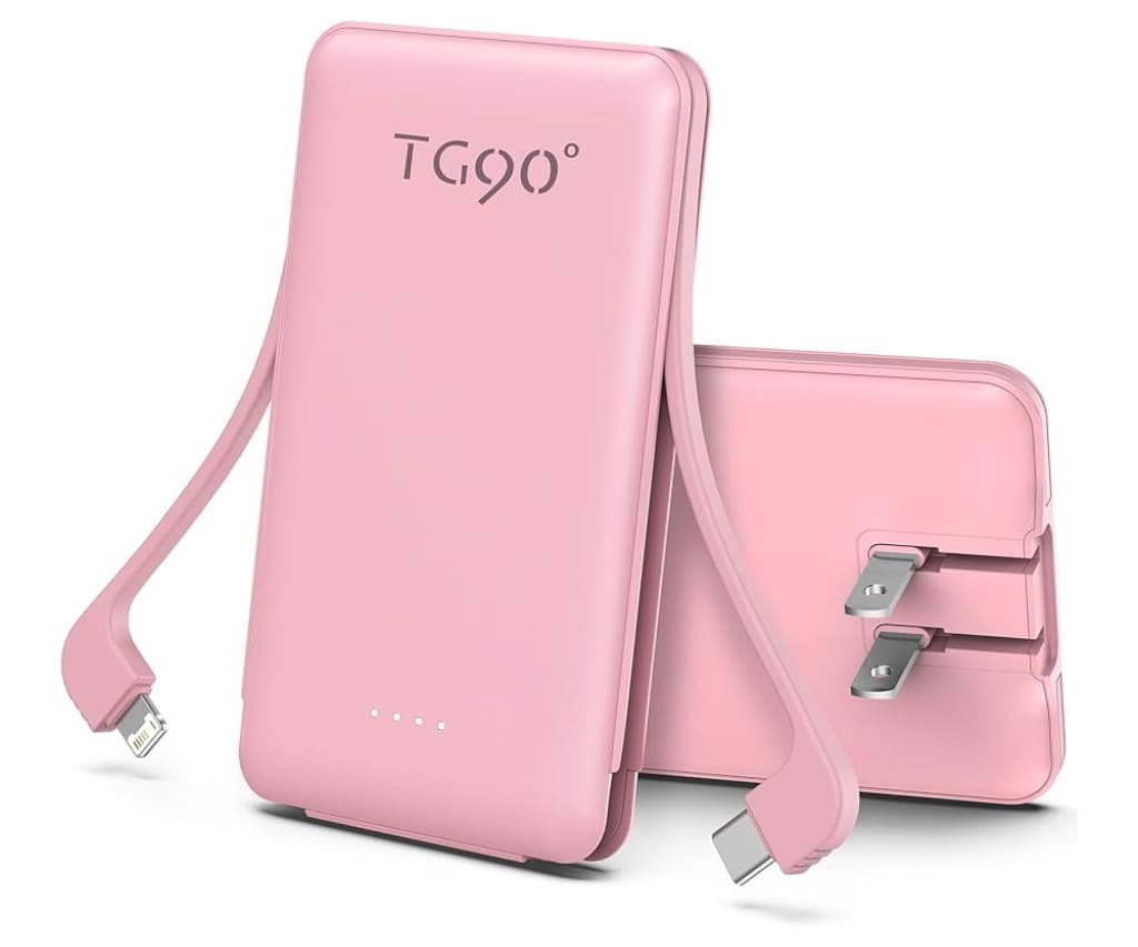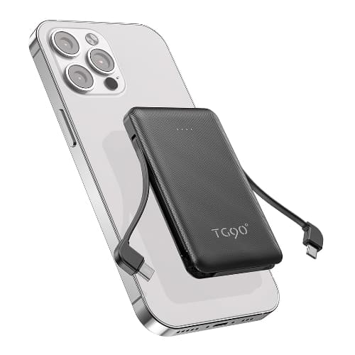 TG90’s power banks deliver compact energy in 5000mAh to 10000mAh capacities, pairing built-in Lightning, USB-C, or micro-USB cables—and sometimes even foldable AC wall plugs—for effortless charging across iPhone, Android, and other devices.